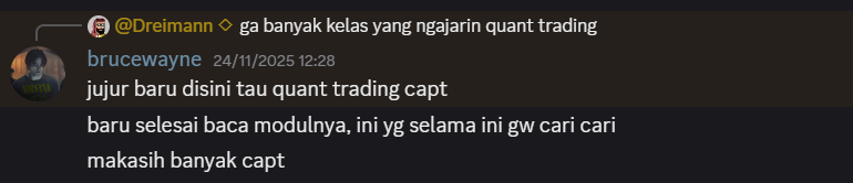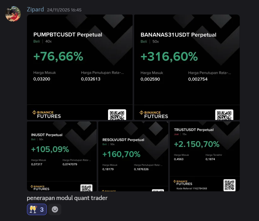 Pendekatan quant ini membantu member masuk posisi dengan conviction tinggi, tahu kapan entry, bertahan, dan exit market.