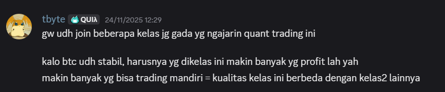 Yang membedakan kami, teknik quant trigger trading ini TIDAK KAMI SIMPAN SENDIRI. Seluruh sistem, logika, dan cara bacanya kami ajarkan agar kamu bisa membaca market secara mandiri.